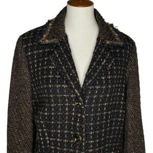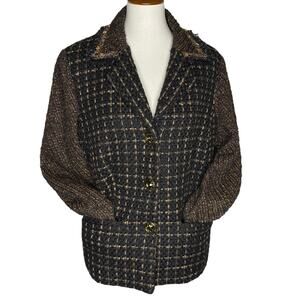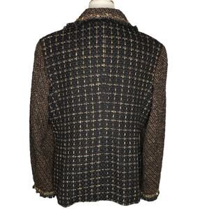 Chico's Tweed Blazer Black Brown Metallic Beaded Fringe Size 12 L Boho Academia