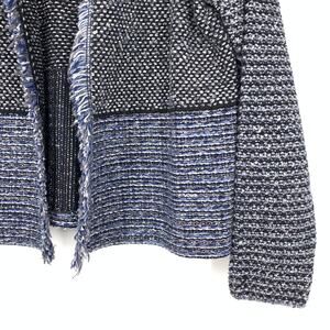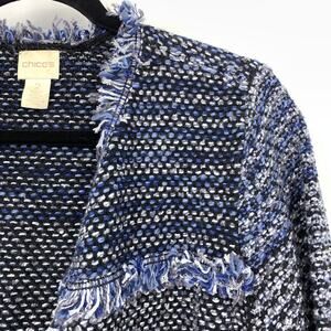 Chicos Tweed Fringe Open Front Knit Blazer Jacket Womens 2 US L Blue Multicolor