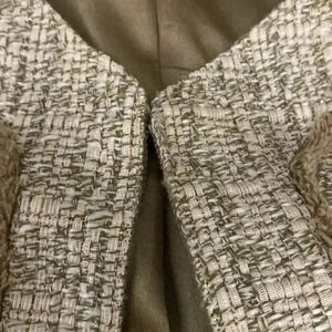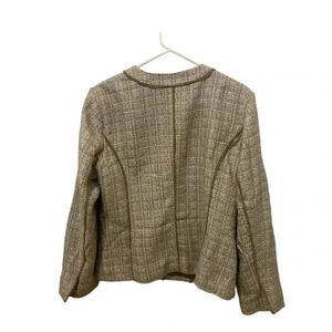 Trendy and chic blazer by Chico’s. Light tan. Features raw brown contrast stitching. Faux front pockets. Lined on the inside. Metallic thread throughout. Perfect for the office or party. Hook and eye modesty closure to front.