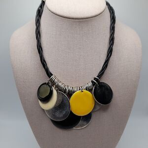 Description: New Chico's pendant necklace with twisted leather cords and metals disks in a variety of colors, some plain, and some with enamel. New With Tags. This would be a great addition to your jewelry collection or make a great gift!
