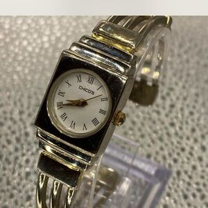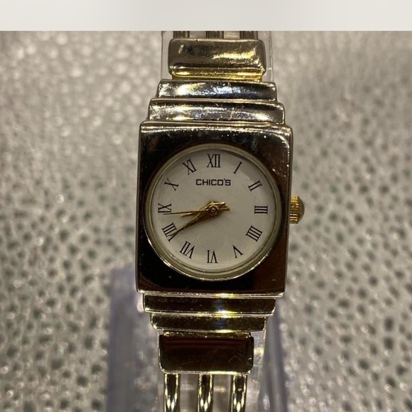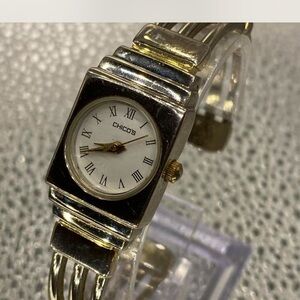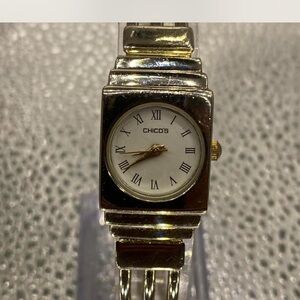 Elegant Chico's watch with a silver and gold design. Features a classic round face with Roman numerals.
