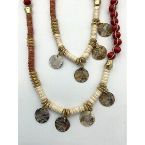 • Shell, wood and beads with gold tone accents that add polish to this dark pink-hued casual design