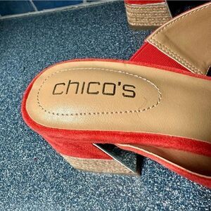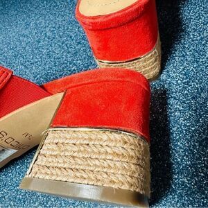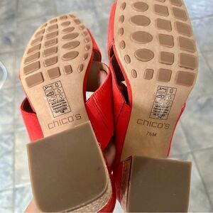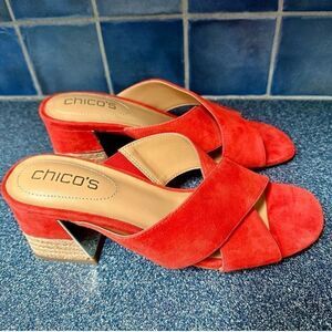 Beautifully crafted orange suede sandals by Chicos with crisscross straps and raffia-wrapped, gold trimmed 2 1/2” block heels. Like new.