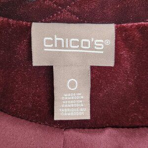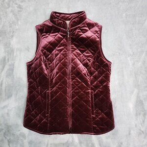 Chico's size 0 (small) velour quilted vest with full zipper, mock neck, and pockets in a burgundy color adds a touch of sophistication to your autumn/winter wardrobe. Can be dressed up for an evening out or worn casually for outdoor fun.