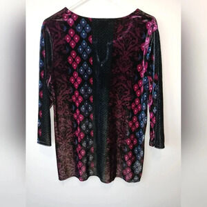 Chico's Artisian Damask velvet v-neck 3/4 sleeve top. Beautiful jeweltones, perfect for the holidays. Looks great with leggings, jeans, or dress pants.