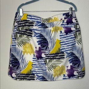 Bold skort ready for tennis or the beach with a mix of blue, purple, yellow, and green patterns. Perfect for a stylish statement.