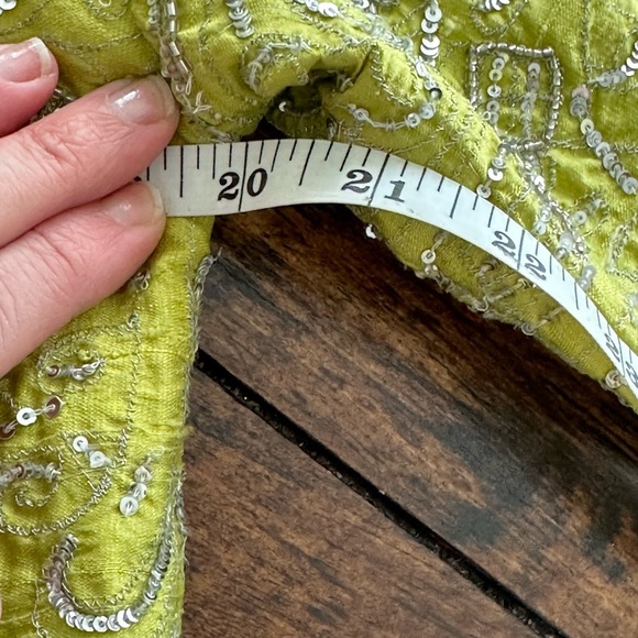 Nice preowned vintage condition, no flaws to note. Embroidery and sequins covering jacket. Open front, cropped style with cuffed sleeves. 100% silk. Chico’s size 0 is a small.