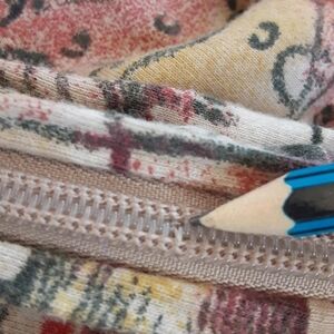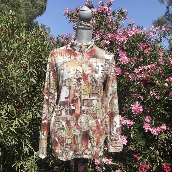 Zip up sweater by Chico's. Has a very uniquely artistic pattern all around. Has a turtleneck style also has usuae pockets. The brand tag is semi ripped and a little bump causing the zipper to slightly jam but still functional (flaws shown in the last two pictures picture) but otherwise it's in Perfect Condition!
