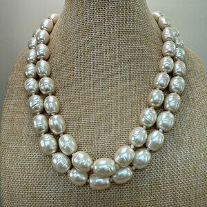 Elevate outfits with a timeless double-strand faux baroque pearl necklace and matching earrings. Versatile and chic, this set complements various styles