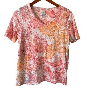 Chico's Warm Paisley Slub Tee Short Sleeve V-Neck Side Slits Slub Cotton Blend