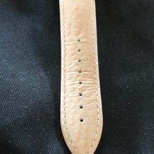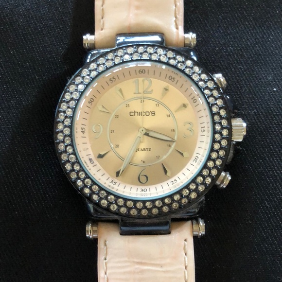 Excellent condition. Pink leather band. Watch face is pink w/ glow in the dark hands. Double toe of clear stones on outside edge. Will come with new battery. The “scratches” on the back are only on the protective plastic covering. Once it’s removed, they won’t be there. Measures 9” from end to end, including buckle.