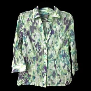 This size 8-10 Chico’s blouse has vibrant watercolor pattern in shades of green and lilac on a white background and silver threading throughout. Machine washable for easy care, this blouse is a must-have for any woman who loves colorful and art-inspired clothing. Great condition with no tears or drains and shops quickly (within 24 hours) from a smoke-free home.