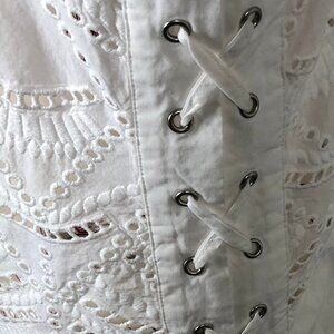 Details: Eyelet cutwork, lace-up side panels, 3/4 sleeves