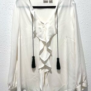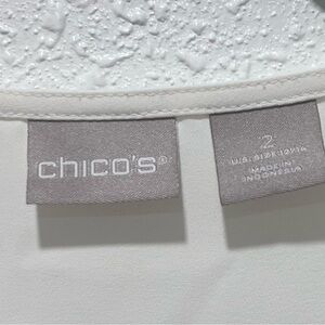 This chic white blouse from Chico's features elegant ruffles and a stylish tie front, adding a sophisticated touch to any outfit. Made from lightweight and flowing fabric, it is suitable for both professional and casual settings.