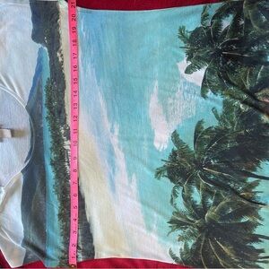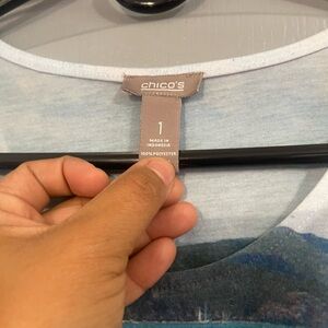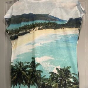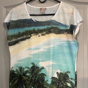 This Chico's t-shirt showcases a stunning graphic design with a white and blue color palette. The short sleeves and comfortable fit make it an ideal choice for casual wear. The eye-catching beach scene print adds a touch of summer flair to your wardrobe.
