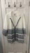 Stylish white jacket with blue textured stripes. Features a unique fringe detail, beautiful beads and collar. Quilted design. 3/4 sleeves or longsleeve (depends on the person)