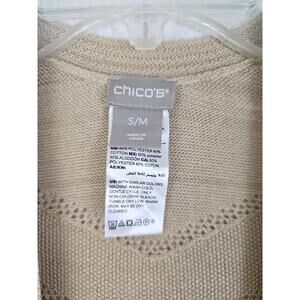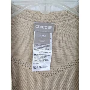 This Chico's beige/tan knit short sleeve kimono is a versatile and stylish option for women in size S/M. Made from a comfortable cotton blend fabric with crochet accents, this open front top features a relaxed fit and kimono sleeves, perfect for casual, workwear, or business occasions. The solid pattern and bohemian theme make it a great addition to your summer, fall, or spring wardrobe. Easy to care for with its machine washable design, this kimono is a practical and chic choice for any woman's wardrobe.