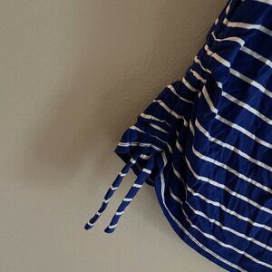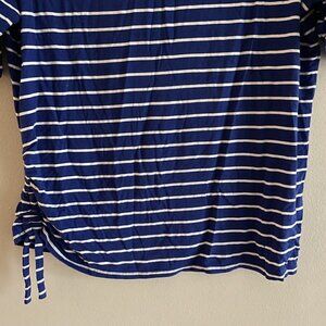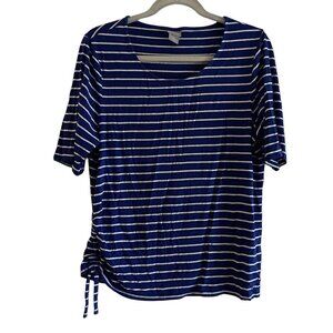 Chicos Women 2 US L Blue White Striped Short Sleeve Scoop Neck Side-Ruched Tee.