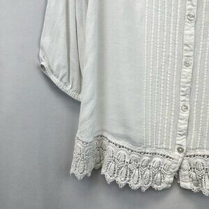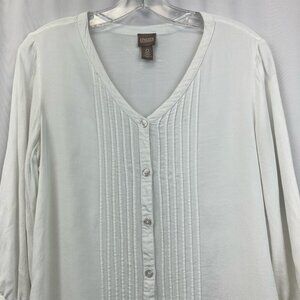 Chicos Women Button-up Blouse White 3/4 Sleeve V Neck Pin Tucks Crochet Lace S/0
