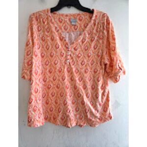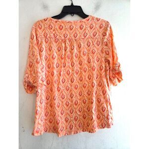Chico's Women Orange White "Flame" Print Cotton/Modal V-Neck Blouse size Large