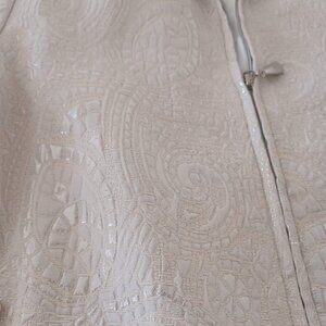Chic and elegant metallic paisley moto jacket from Chico’s. Features a shimmering silver-on-ivory textured brocade fabric with a flattering tailored fit. Fully lined with front zipper closure and two functional zip pockets. Perfect for evening wear, holidays, or adding a touch of sparkle to any outfit.