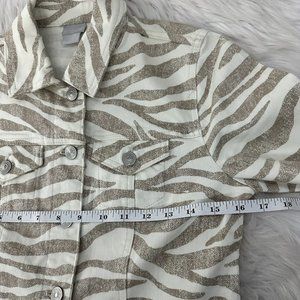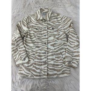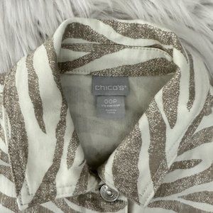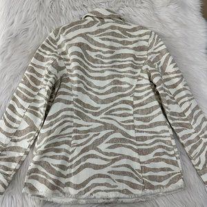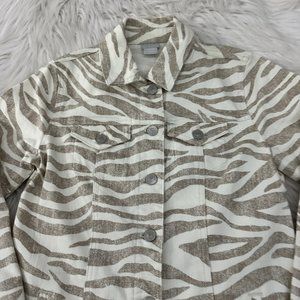 Chicos Womens 00P Zebra Print Button Up Jacket Stretch Fringe Bottom.