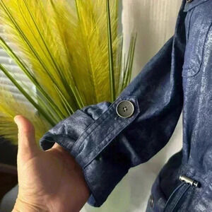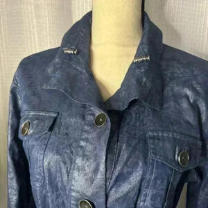 This Chico's women's jacket is a stylish addition to your wardrobe. The metallic chambray fabric has a paisley pattern that adds a touch of elegance to the blue jacket. The 3/4 sleeves and elastic waist make it comfortable to wear. The cotton outer shell material ensures durability and comfort, making it a great choice for any occasion.