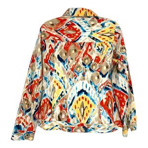 Elevate your wardrobe with this colorful and artsy blouse jacket from Chico's. This pre-owned item features a cotton blend outer shell and a comfortable cotton lining. It has long sleeves and a button-up front with accent buttons, making it a stylish and versatile addition to your collection.