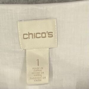 Chico’s women’s top, size 1. White cotton blend v-neck blouse with lace trim and bell sleeves. Soft polka dot texture—perfect business casual or elegant everyday piece.