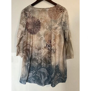 Chico’s Women’s 2 Large L Printed Top 3/4 Sleeve Sharkbite Hem Medallion Beige