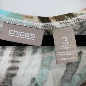 Chico's Abstract Zebra Brushstroke Tunic Top in a brown and teal print, Chico's size 3 (L/XL). Crafted from a comfortable jersey knit, this pullover style features versatile 3/4 sleeves. Good preowned condition.