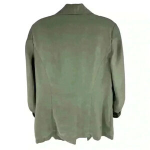 This women's medium-sized jacket is crafted from a soft and durable fabric, featuring a solid green color and a relaxed fit. It has a lapel collar, long sleeves with button cuffs, and a button closure. The mid-length design makes it ideal for layering during fall and spring. Suitable for casual and semi-formal occasions, this lightweight jacket offers comfort and style. The jacket is pre-owned.