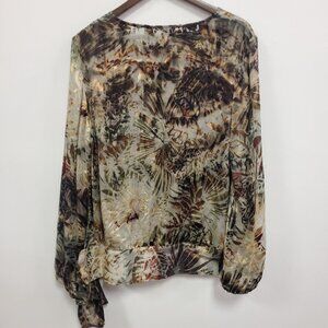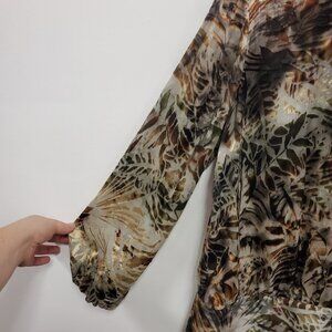 Chicos Womens Artsy Rayon Silk Burnout Top Size 2 L Brown Hawaiian Leaf Resort
