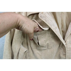 This is a Women's Chico's Women's Beige Corduroy Jacket that is a size 3. It is 87% Polyester and 11% Nylon. Laying flat, it measures: Armpit to armpit-23.5" and the length is 23.5". It is in great condition and is a really cute jacket.