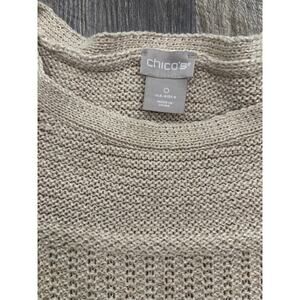 A cozy beige knit sweater from Chico's featuring a textured pattern and relaxed fit. Perfect for layering during cooler seasons. It is a women's size small.