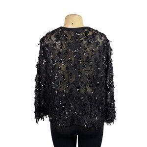 Chico's Women's Black Nylon Polyester Embroidered Sheer Jacket Size 3 Sequins Details. Features intricate floral embroidery and shimmering sequins against a sheer mesh base. Lightweight and fully lined for comfort. Round neckline with hook-and-eye closure. Measurements: Bust approximately 23", Shoulder to hem approximately 24.5". Made in China.