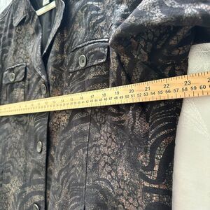 Elevate your style with this stunning copper and black blazer from Chicos, featuring a shimmering abstract animal-inspired pattern that blends elegance with modern flair. Designed for versatility, this long, mid-length blazer is perfect for travel, parties, casual outings, or professional settings.