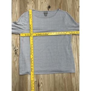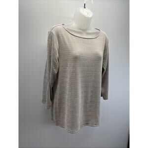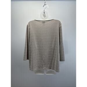 Chicos Womens Blouse 2 Brown White Seersucker Gingham Stretch Fall EUC Elevate your wardrobe with this stunning Chico's women's blouse. The brown and white striped pattern is perfect for any occasion, whether it be travel, weddings, parties, or even workwear. The round neckline and 3/4 sleeves create a casual yet sophisticated look that will keep you stylish all day long.