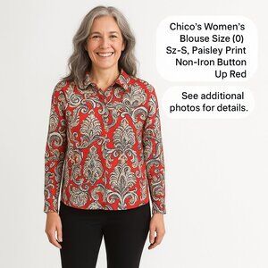 Add a pop of color and pattern to your wardrobe with this Chico's Women's Blouse in Size 0 (equivalent to US 4). The blouse features a vibrant red paisley print that adds a touch of flair to any outfit. Designed with convenience in mind, the non-iron fabric means it's easy to care for and always looks polished. The tailored fit and button-up style make it a versatile choice for both casual and formal occasions. Lightweight and breathable, this blouse offers all-day comfort. This blouse is offered by Parrot's Creatives Online Closet.