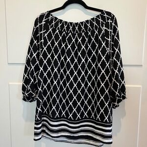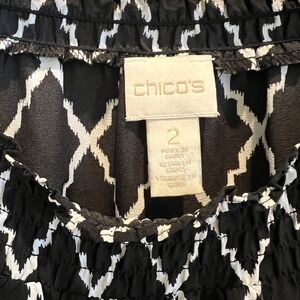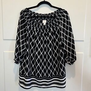 Keywords: Chicos blouse, womens top, black and white blouse, geometric print top, 3/4 sleeve blouse, elastic neckline, off the shoulder top, banded hem blouse, chicos size 2, polyester blouse, workwear blouse, casual blouse, black and white top