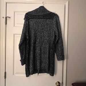Keywords: Chico's cardigan, blue sweater, women's knitwear, fall fashion, casual wear, snap front, chain detail, long sleeve, cozy cardigan, pre-owned sweater, excellent condition.