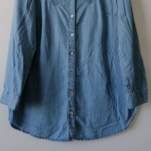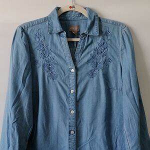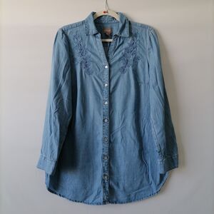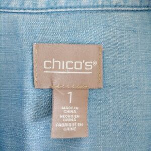 Chico's Women's Blue Chambray Embroidered Button up Shirt Size 1 US Medium