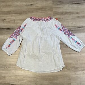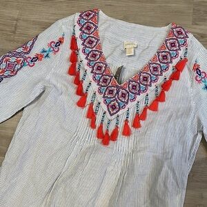 Chico's Women's Blue Embroidered Bohemian Tassel Blouse Top - Size Small