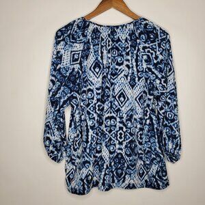 This Chicos women's top, size 2, boasts a striking blue-white pattern. Made from 100% Polyester, it features 3-quarter sleeves and a 22-inch bust. Note, there's a slight tear.