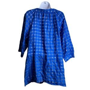 Chico's Women's Blue Metallic Plaid Check Tunic Linen Top Size 2 Large Oversized