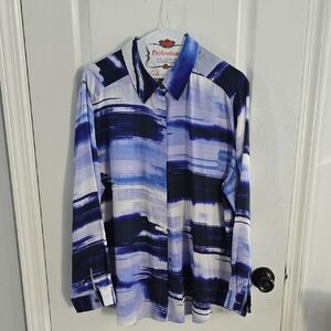 Stylish button-down with abstract blue and white pattern. Ideal for a chic look. Chico's 3 is a 16/18.