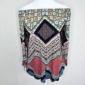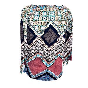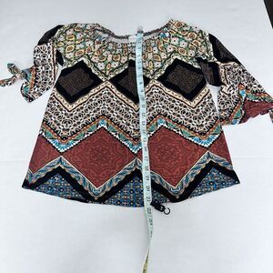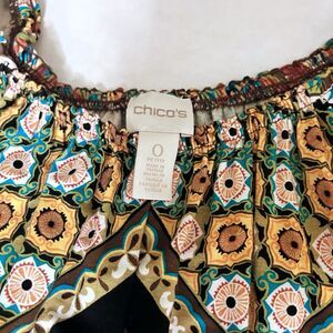 The Chicos Womens Boho Flared Tied Sleeve Size 0 Top is a stylish and versatile piece perfect for casual occasions. Made from a comfortable blend of rayon and spandex , this blouse features a flattering 3/4 flared tied sleeve, round neckline. The multicolor design adds a trendy touch, while the off-shoulder style allows for easy layering. Machine washable and suitable for various seasons like summer, fall, and spring, this blouse from Chico's is a must-have for any fashion-forward woman looking to refresh her wardrobe.
