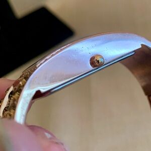 Watch is in used condition with some slight discoloration below face and couple small cosmetic scratches.