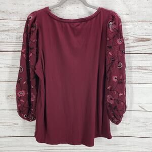 Chico's Women's Burgundy Floral Embroidery Long Sleeve Top Size 3