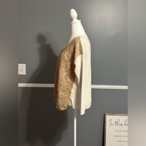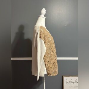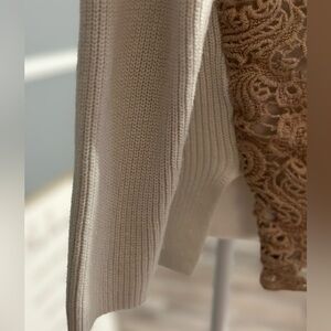 Description: This gorgeous piece features a v-neck with a tan lace overlay on a cream colored sweater. It is a great neutral piece that can easily be worn to the office with slacks. Easy enough to dress up with a pair of jeans and flats.